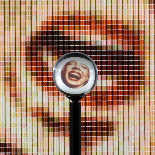 hanging apparatus, clear acrylic sphere, metal stand Marilyn 2 is constructed from 3024 spools of thread so the image resolution is fairly low. Yet when seen through a viewing sphere, the thread spools condense into a recognizable image, conveying how little information the brain needs to make sense of visual imagery it has already been exposed to. At first glance, the thread spool installation appears to be a random arrangement of spools of thread. A clear acrylic sphere placed in front of the work, shrinks and condenses the thread spool "pixels" into a recognizable image while also rotating the imagery 180 degrees like the human eye. This shift in perception functions as a dramatic mechanism to present the idea that there is no one truth or reality, emphasizing subjective reality vs. an absolute truth.