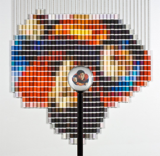 apparatus, clear acrylic sphere, metal stand Superman is constructed from 690 larger spools of thread so the image resolution is very low. Yet when seen through a viewing sphere, the thread spools condense into a recognizable image, conveying how little information the brain needs to make sense of visual imagery it has already been exposed to. At first glance, the thread spool installation appears to be a random arrangement of spools of thread. A clear acrylic sphere placed in front of the work, shrinks and condenses the thread spool "pixels" into a recognizable image while also rotating the imagery 180 degrees like the human eye. This shift in perception functions as a dramatic mechanism to present the idea that there is no one truth or reality, emphasizing subjective reality vs. an absolute truth. |